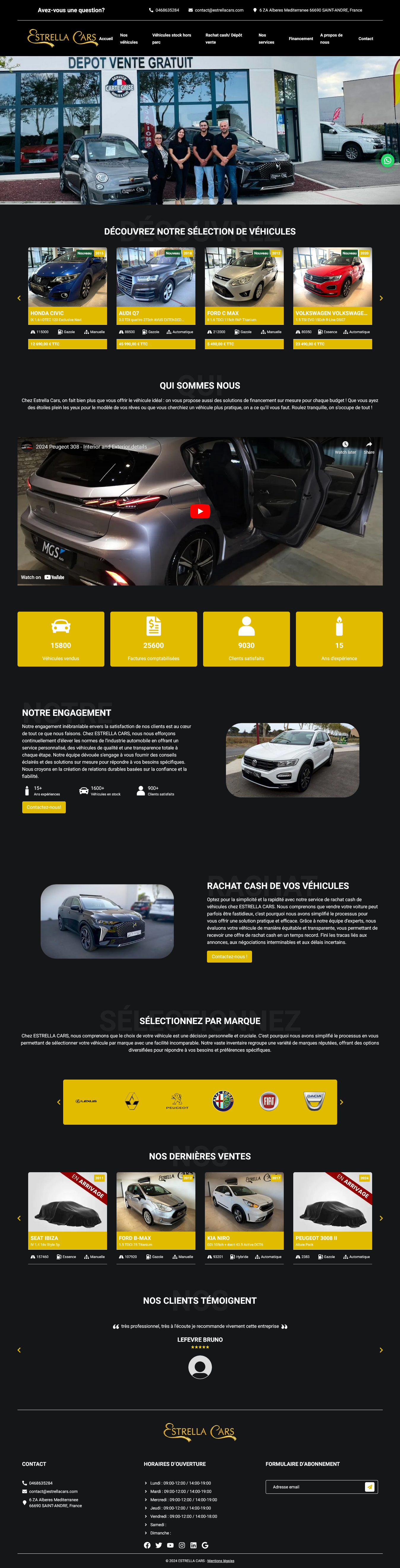 We developed the Estrella Cars Auto website, a platform for Estrella Cars, an automotive dealership located in Saint-André, Pyrénées-Orientales. The site highlights their specialization in selling new and used vehicles, including recent models and zero-kilometer cars. It also provides features for agency contracts to assist individuals in selling their vehicles and includes financing solutions for convenient purchases.